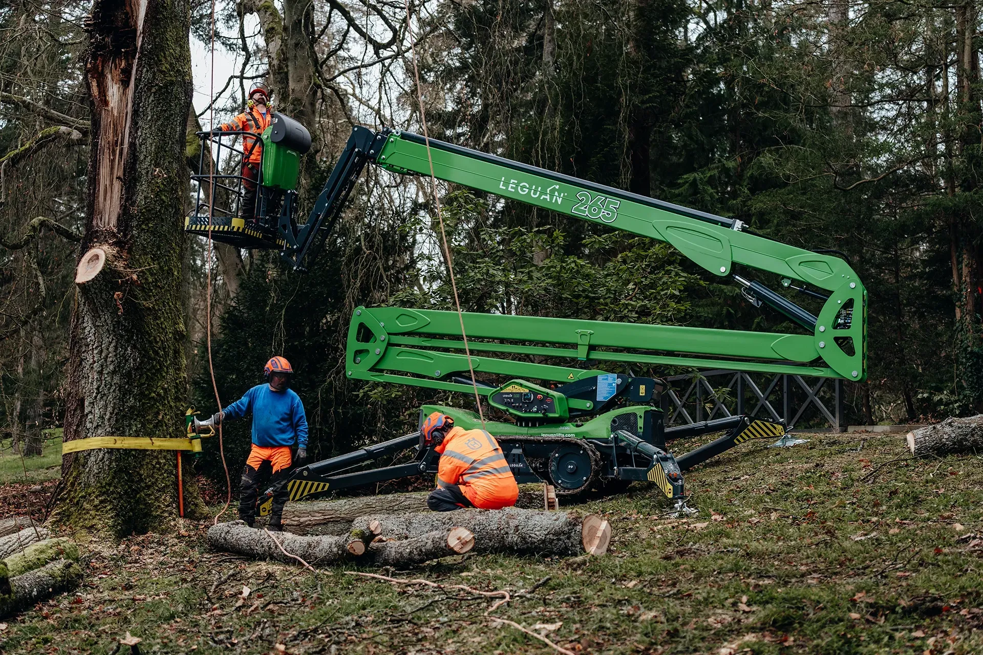 Für Arbeiten in der Baumkrone – etwa bei der Verkehrssicherung, Totholzentfernung oder Pflegearbeiten – sind Hubarbeitsbühnen von Leguan Lifts die ideale Ergänzung. Sie verbinden große Reichweiten mit exzellenter Geländegängigkeit und hohen Standsicherheitsstandards. Alle Modelle verfügen serienmäßig über eine automatische Abstütznivellierung, proportionale Reichweitenüberwachung sowie eine intuitive Joystick-Steuerung, die präzises und sicheres Arbeiten ermöglicht.