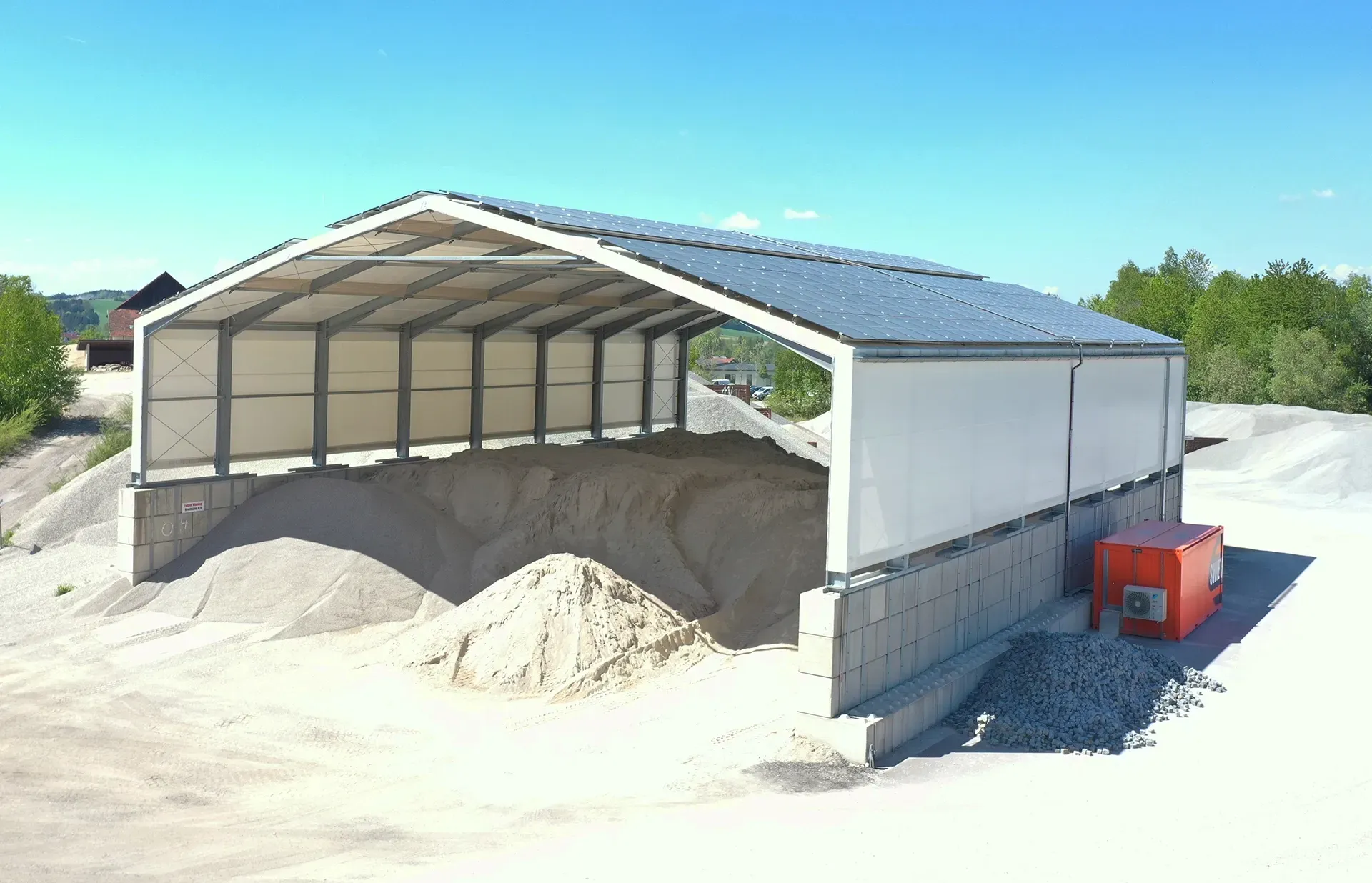 Agrotel Hallensysteme lassen sich maßgeschneidert auf alle Lagerflächen anpassen, bieten freitragende Spannweiten von bis zu 80 m, große Einfahrts- und Abkipp-Höhen und können individuell mit Toren oder Windschutzsystemen ausgestattet werden. Ausgeführt als Rundbogen-, Pultdach- oder Satteldachkonstruktion schaffen sie strukturierte Lagerflächen für Schüttgut, Recyclingmaterial oder Baustoffe. Auch die Anbringung von PV-Anlagen ist problemlos möglich. Planung, Produktion und Montage der Hallensysteme erfolgen schnell und flexibel, sodass kurzfristig auf betriebliche Anforderungen reagiert werden kann.