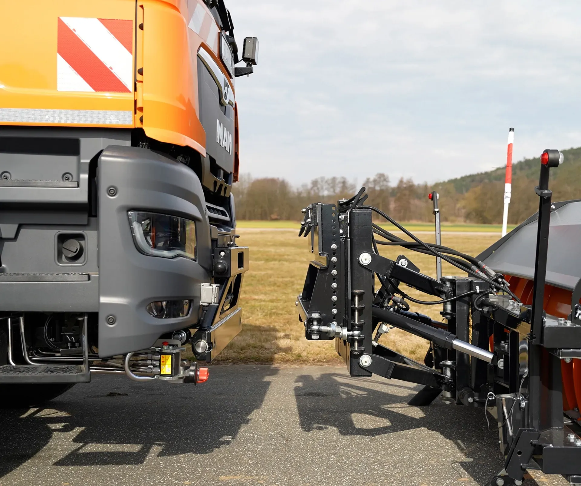 Im Bereich Anbautechnik zeigt Bucher Municipal unter anderem die zweiteilige GSR-Anbauplatte, die eine Nutzung bestehender Sensorsysteme ohne Anpassung am Fahrzeug ermöglicht. Ergänzend dazu wird erstmals eine fest montierte Frontplatte (F1/F1C) mit integriertem Sensorausschnitt präsentiert, die dauerhaft am Fahrzeug verbleibt und nicht mehr gemeinsam mit dem Anbaugerät demontiert werden muss.