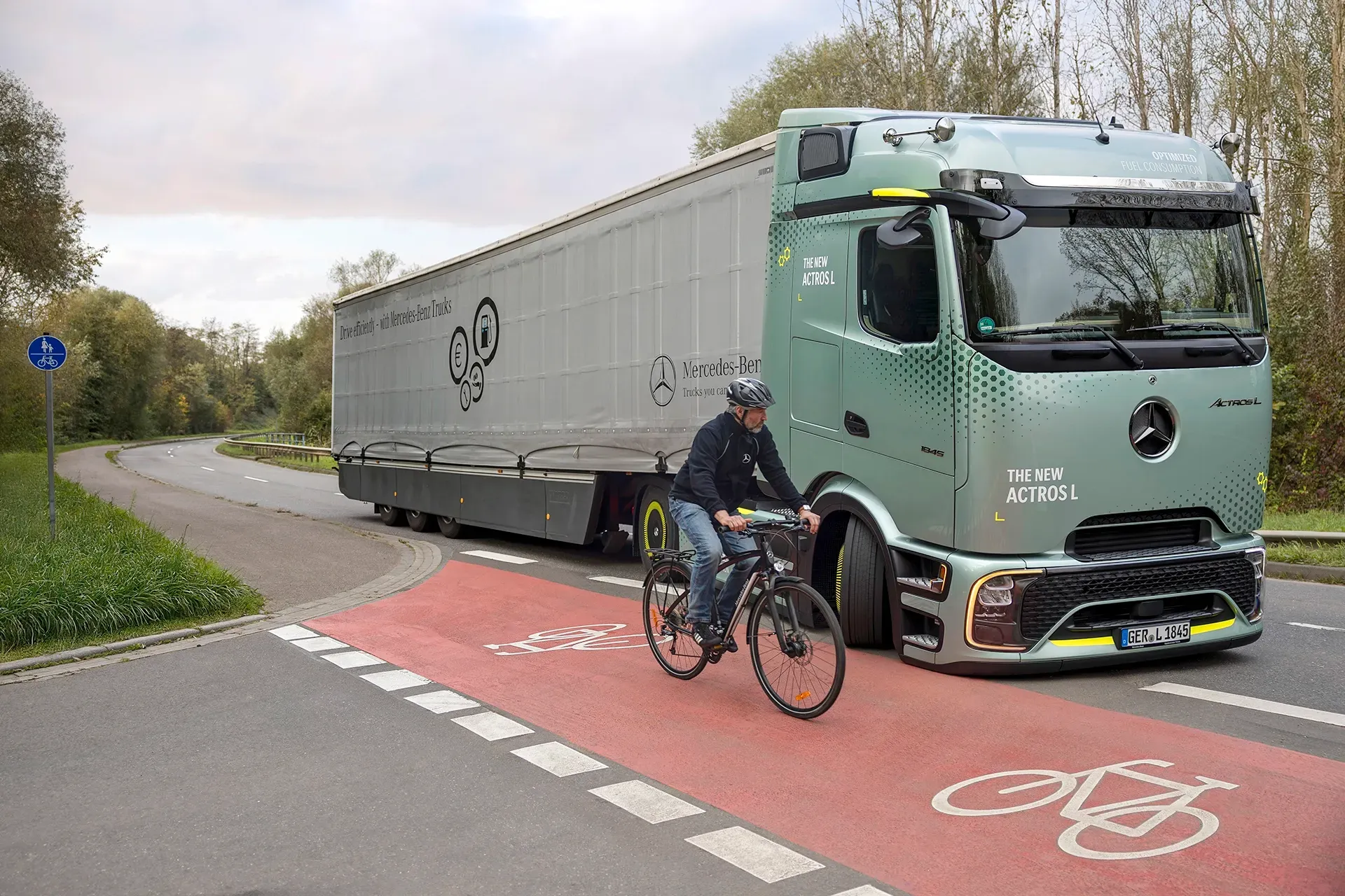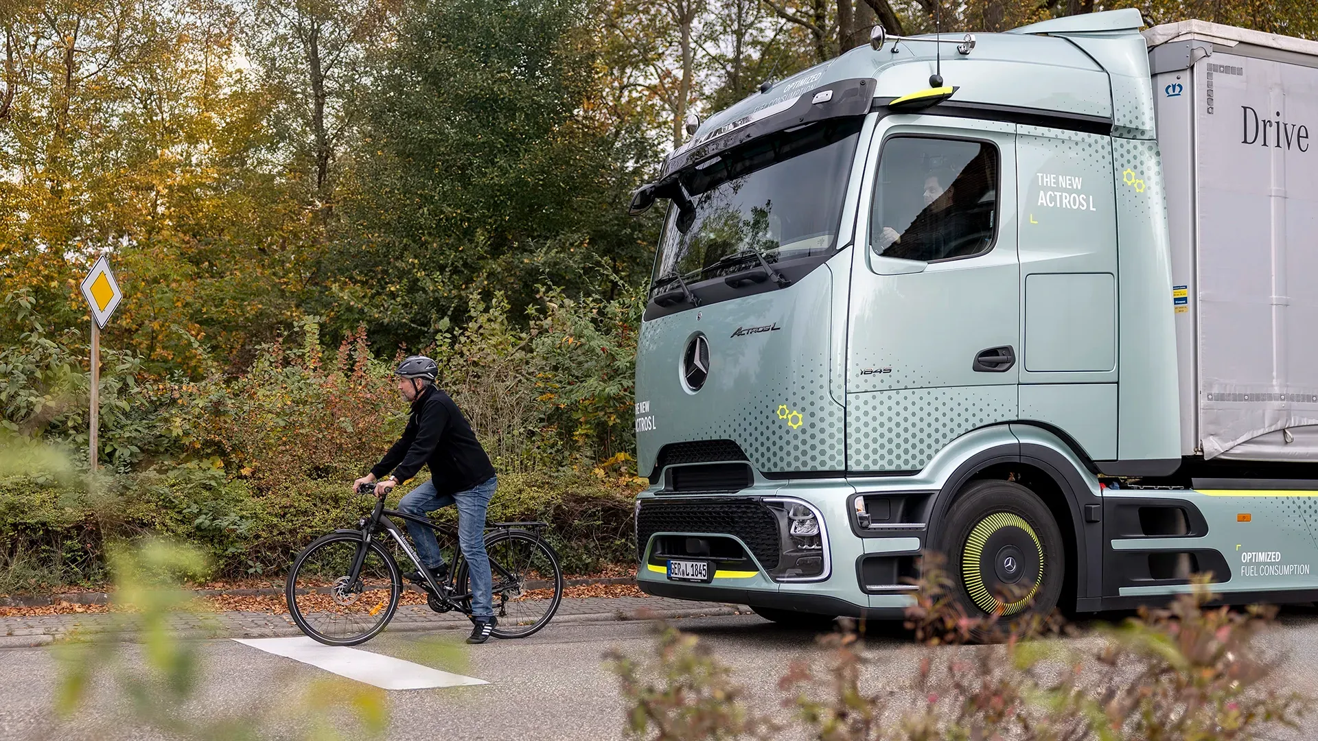 Ein hoher Anspruch von Mercedes-Benz Trucks ist es, dass die Fahrer in jeder Verkehrssituation möglichst sicher unterwegs sind. Zu diesem Zweck sorgen die in den verschiedenen Fahrzeugvarianten verfügbaren Assistenzsysteme dafür, dass sie Gefahren rechtzeitig erkennen, frühzeitig abbremsen und den Überblick über das Verkehrsgeschehen behalten können. Die elektronischen Helfer können insbesondere dazu beitragen, dass Momente der Unachtsamkeit etwa aufgrund von Übermüdung, Stress oder Ablenkung für alle Beteiligten möglichst ohne schwere Folgen bleiben(⁷). Das Sicherheitskonzept der zweiten eActros-Generation beruht, wie auch bei den anderen Baureihen von Mercedes-Benz-Trucks, auf der Weiterentwicklung bewährter Sicherheits-Assistenzsysteme. Die neu entwickelte und mit dem eActros 600 und dem Actros L neu eingeführte Elektronikplattform bietet eine 20-fach höhere Datenverarbeitung im Vergleich zu den Vorgängerversionen, die insgesamt sechs verbauten Sensoren können einen Winkel von 270 Grad um das Fahrzeug herum abdecken. Dadurch sind Assistenzsysteme wie Active Brake Assist 6, Active Sideguard Assist 2, Front Guard Assist oder Active Drive Assist 3 für teilautomatisiertes Fahren (SAE Level 2) in der Lage, ihre Stärken noch besser auszuspielen. Die Systeme gehen dabei zum Teil deutlich über die gesetzlichen Vorschriften hinaus. Das gilt auch für die seit 2022 beziehungsweise 2024 geltenden Standards der von der EU erlassenen General Safety Regulation (GSR).