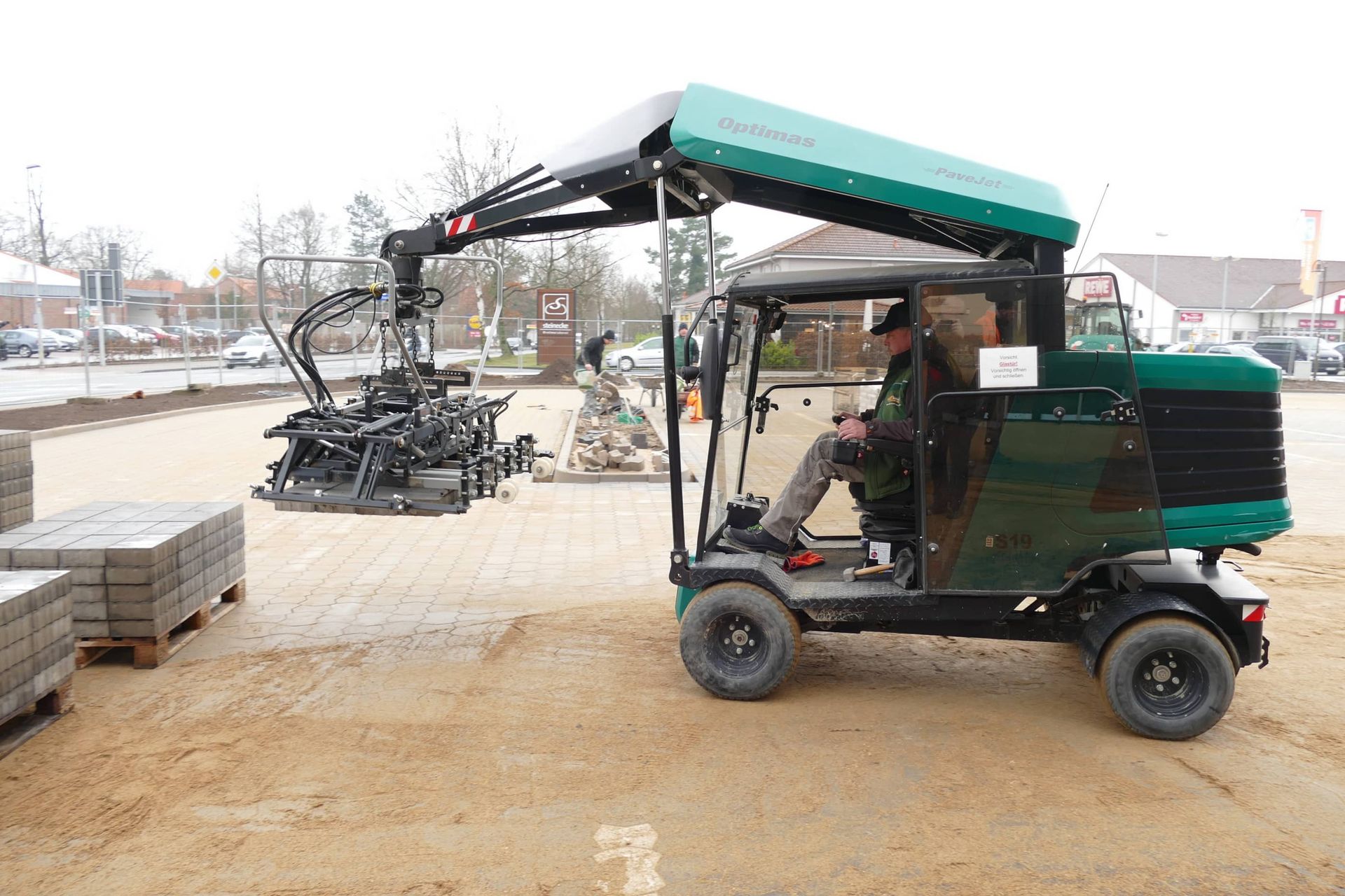 „Vor etwa 40 Jahren hat mein Vater Optimas auf einer Messe kennengelernt. Seitdem nutzen wir diese robuste Technik. Robust heißt heute für uns, dass wir zum Beispiel die Pflastermaschinen circa 7.000 Stunden ohne Reparaturprobleme nutzen können“, sagt Leide. Das beschreibt die Fertigungsqualität von Optimas. Dass das Unternehmen seine Maschinen immer weiterentwickelt, kann man auf der derzeitigen Baustelle bei Braunschweig sehen. Hier ist eine Pflasterverlegemaschine S19 PaveJet ohne Lenkrad, aber mit Joysticklenkung im Einsatz. Der Fahrer kann sich entspannt im luftgefederten Fahrersitz wohlfühlen und per Joystick arbeiten. Die vielen Meter Drehen des Lenkrads fallen weg. „Es hat schon ein paar Tage gebraucht, bis ich mich umgestellt hatte. Aber jetzt möchte ich nicht mehr anders arbeiten“, sagt Max Brauer, der Fahrer. Er hat reichlich zu tun. 8.500 m² Parkfläche und Zuwegungen, vom Tiefbau über Pflasterung inklusive der andersfarbigen Parkplatzbegrenzungen, müssen für einen großen Verbrauchermarkt gebaut werden.