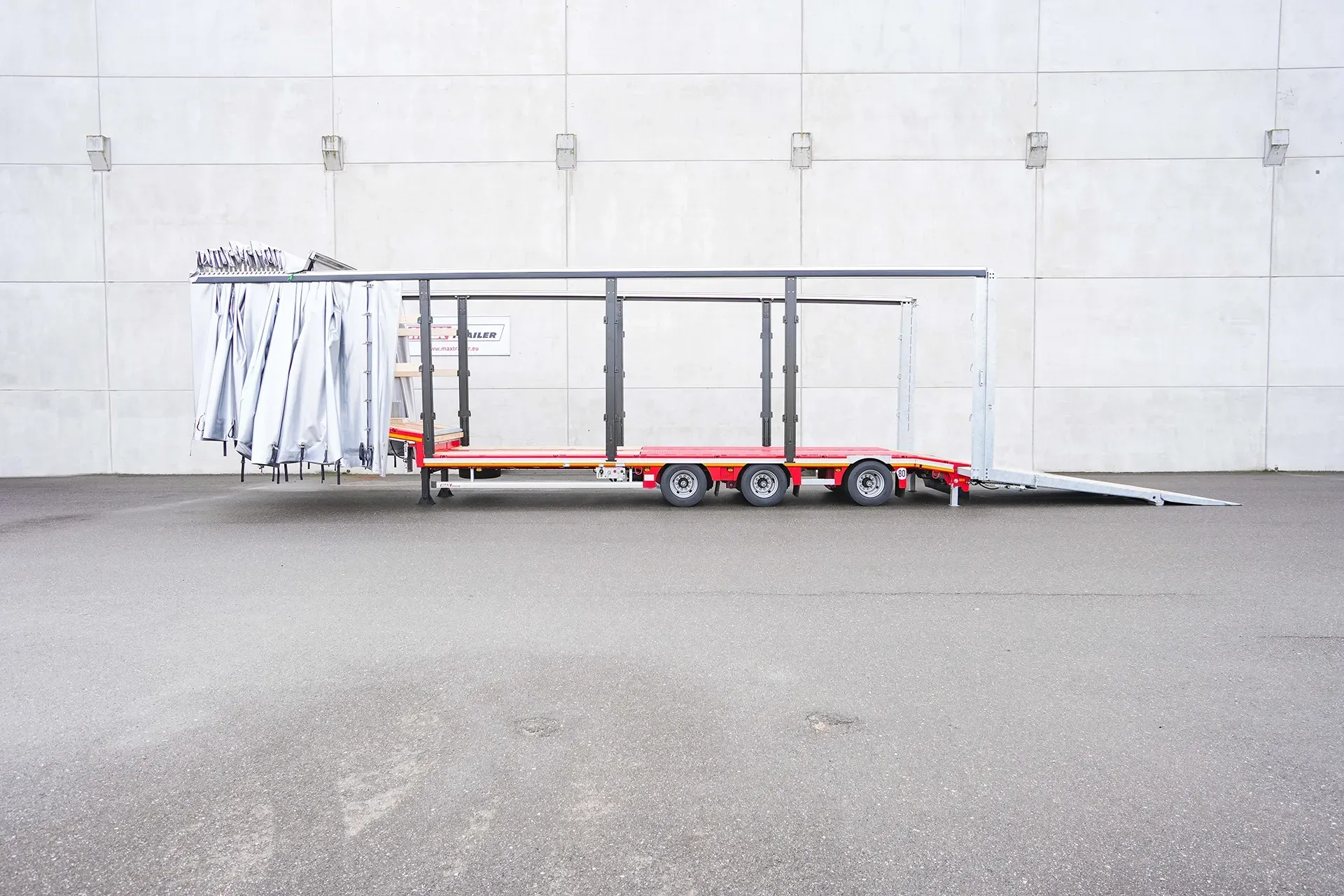 Dieses Prinzip bietet den Vorteil, dass die Ladefläche von allen Seiten frei zugänglich ist. Das gestattet ein schnelles und einfaches Be- und Entladen, wobei der Semitieflader immer abgedeckt bleibt. Die Schiebeplane lässt sich schnell öffnen, um die Fracht entweder über die 1.250 mm breiten Doppelrampen oder bei Bedarf seitlich aufzuladen.