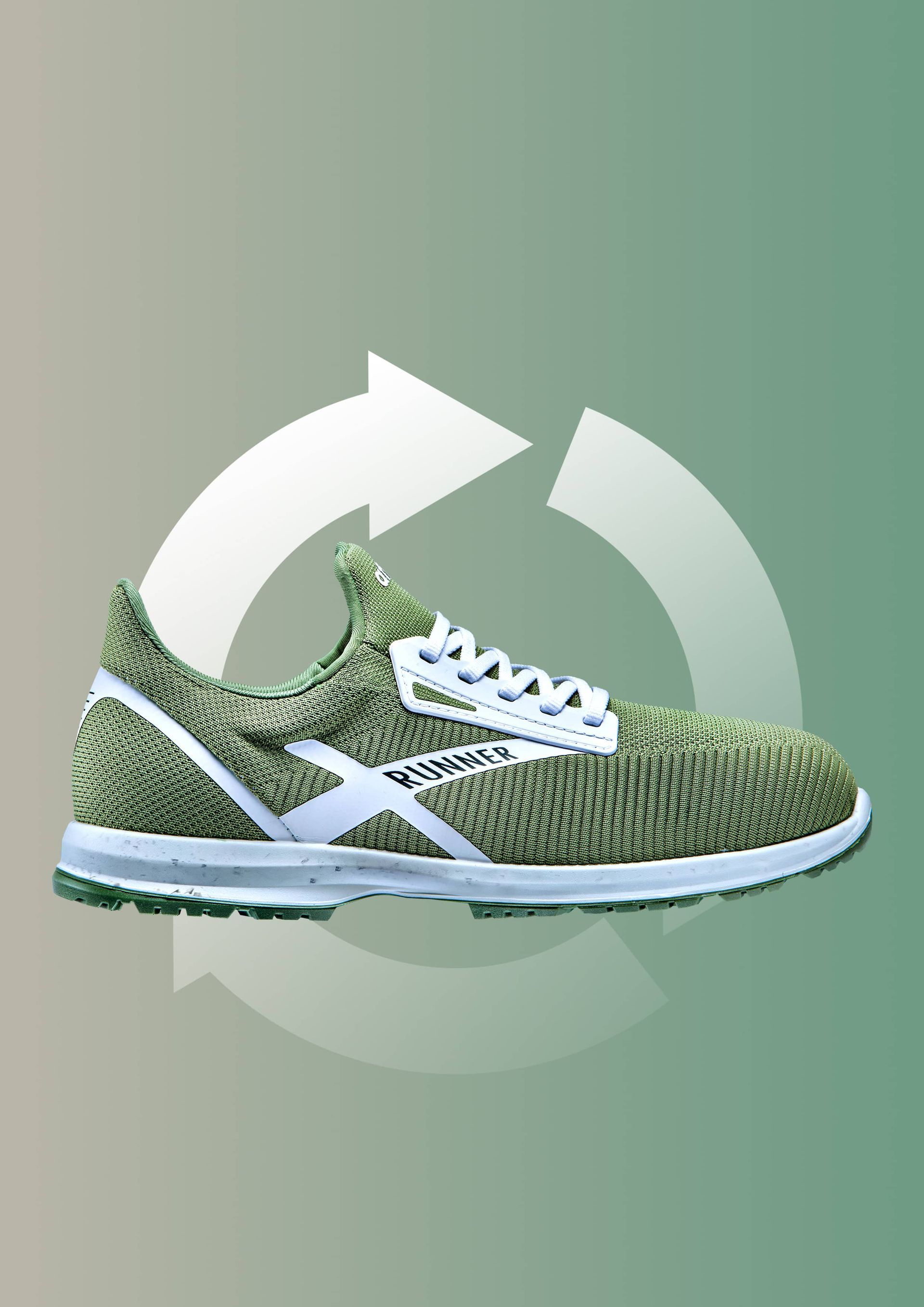 Aus MESH-Obermaterial wird PET-Obermaterial: Der Schaft des Recycling Safety Shoe besteht zu 92 % aus wiederverwerteten PET-Flaschen. Dafür verwendet der Hersteller einen speziellen Polyester namens »Repreve«, den schon zahlreiche andere namhafte Brands nutzen. Um »Repreve« Polyester herzustellen, werden weltweit gesammelte Kunststoffflaschen und postindustrielle Abfälle zerkleinert, gemahlen, gewaschen und zu hochwertigen Spänen verarbeitet. Diese Späne werden zu flüssigem Polymer geschmolzen und durch winzige Öffnungen in einer Spinndüse extrudiert, wobei Filamente entstehen, die die Faser bilden. Das Unternehmen Unifii spinnt die Faser zu Garn, aus dem ein Stoff gewoben wird: der »Repreve« Polyester.