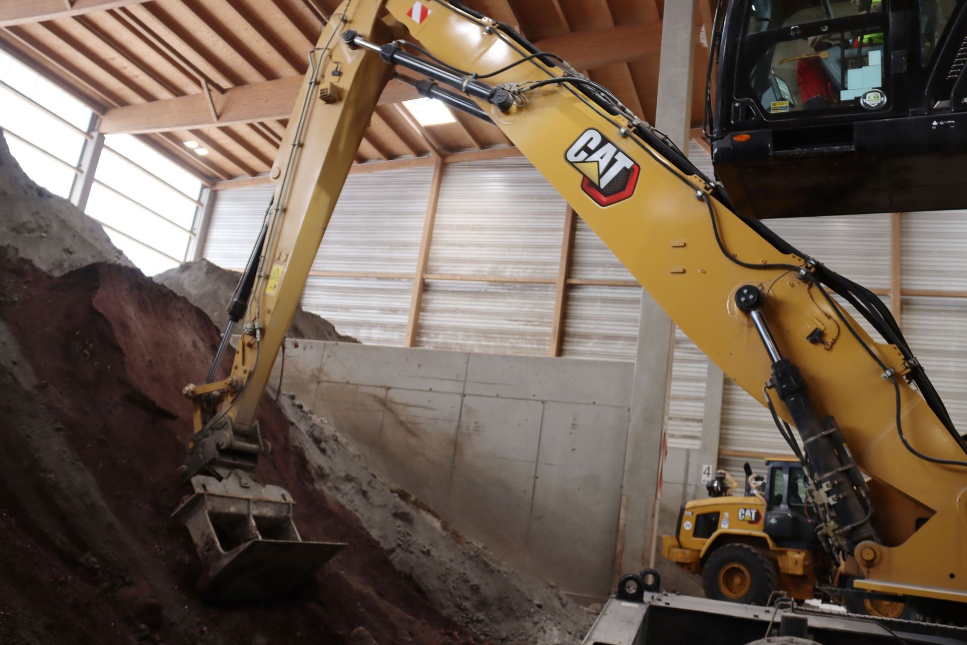 Eine Sonderrolle hat bei Aurec in Bernburg ein Cat Umschlagbagger MH3026. Er wurde auf-grund seiner hochfahrbaren Kabine gewählt, denn so hat der Fahrer einen guten Überblick in die Lkw-Mulden, welche die mineralischen Baustoffe anliefern. Weil sich die Mulden beim Abkippen nicht immer komplett leeren, erhielt der Bagger ein besonderes Anbaugerät. Es funktioniert wie ein Schaber und soll das Material auskratzen. „Das ist ein Service, den wir unseren Kunden bieten“, meint Dr. Robert Wermuth. Die Idee für das Werkzeug an der Cat Maschine hatte Thomas Krüger, ausgeführt wurde sie von Resch-Ka-Tec. Anforderung war, das anhaftende Material aus den Mulden zu entfernen, ohne den Fahrer dabei zu gefährden oder den Muldenkörper zu beschädigen. Inzwischen haben die Mitarbeiter von Aurec einen weiteren Verwendungszweck entdeckt: Sie nutzen den langen Ausleger in Verbindung mit dem Werkzeug, das quasi wie eine Maurerkelle funktioniert, um mit dem Umschlagbagger das Material in der Halle 2A aufzuhalden und damit nach oben zu schieben. So können Mieten mit mehr Volumen für den späteren Versatz angelegt werden.