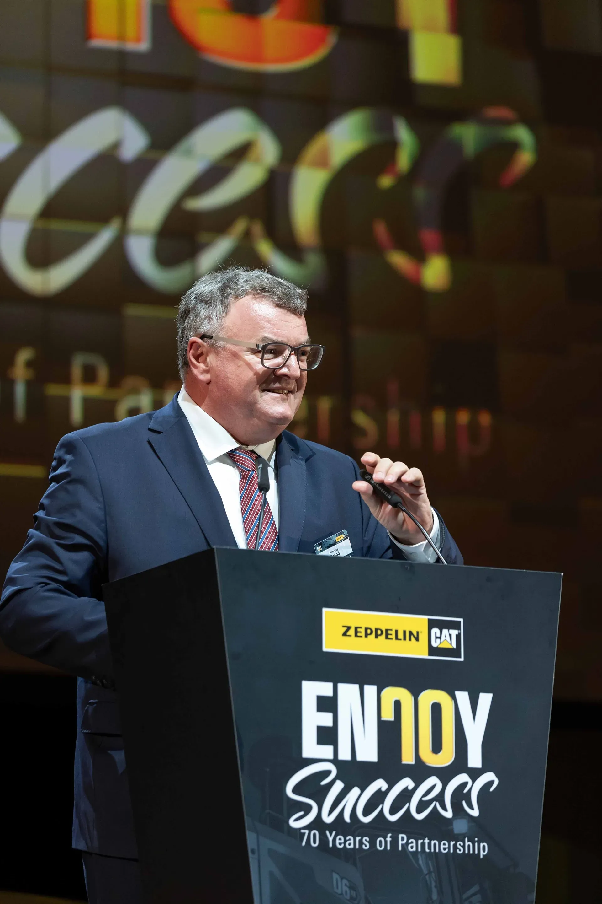 Auf die Besonderheiten der Eigentümerstruktur des Stiftungsunternehmens Zeppelin ging Andreas Brand, Aufsichtsratsvorsitzender und Oberbürgermeister von Friedrichshafen, ein. Er machte deutlich, wie sich diese auch in der Zusammenarbeit mit den Kunden niederschlägt. Er berichtete von seiner Anfangszeit in der Kommunalpolitik, in der er bei Spatenstichen und Grundstückserschließungen ersten Kontakt zu Cat Baumaschinen gesammelt hatte. „Mit den Jahren habe ich verstanden, welche Bedeutung die Geräte für unsere Kunden haben. Ohne den Erfolg unserer Kunden wären wir heute nicht hier. Und den Erfolg verdanken wir dem Wertvollsten: dem Vertrauen unserer Kunden. Da es immer um Geschäfte zwischen Menschen geht, ist es umso wichtiger, gemeinsam die beste Lösung zu finden und Kunden das beste Produkt zu bieten.“