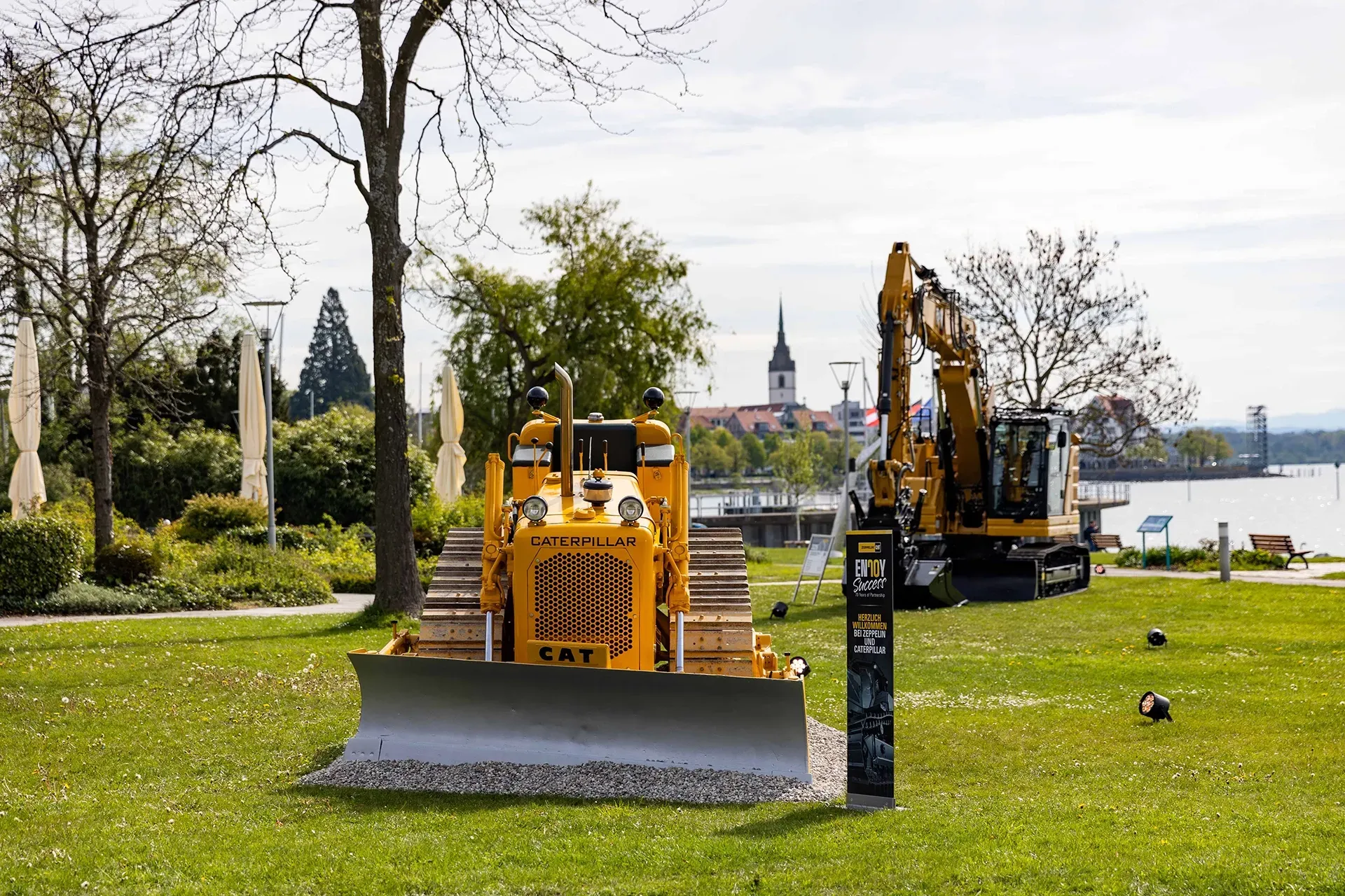 Gelbes Eisen war nicht nur in Reden und Filmen omnipräsent, sondern Baumaschinen flankierten die Bühne, standen Spalier zur Begrüßung oder umrahmten das Graf-Zeppelin-Haus. Im Fall eines historischen Cat Dozers D4, Baujahr 1964, bildete der Baumaschinen-Oldtimer ein beliebtes Fotomotiv für Selfies vor der Kulisse am Bodensee – dort, wo für Zeppelin einmal alles begann. Nachdem die Ära der Luftschiffe zu Ende war, versuchte das damalige Zeppelin Metallwerk, das später zum Zeppelin Konzern wurde, ein neues Geschäftsfeld aufzubauen. Ein Werkstattwagen geriet vor 70 Jahren zum Schlüsselerlebnis: Die Eigenkonstruktion, konzipiert für Reparatur- und Instandhaltungsarbeiten, wurde darum auf der Automobilmesse in Genf, dem Schauplatz von Fahrzeugen der Automobilindustrie, präsentiert. „Zufällig hat diese Erfolgsgeschichte begonnen – man müsste sie eigentlich verfilmen“, räumte Fred Cordes ein. Der Werkstattwagen erregte die Aufmerksamkeit von Caterpillar. Ein hochrangiger Manager war extra von Chicago nach Genf gereist, um damals nicht nur die Schaltzentrale von Caterpillar für Europa, den Mittleren Osten und Asien, zu besuchen, sondern auch auf dem Automobilsalon Ausschau nach neuen Vertriebsmöglichkeiten für den wachsenden deutschen Markt zu halten. „Beim Anblick des Servicewagens musste er wohl gedacht haben, dass Zeppelin prädestiniert war, um den Vertrieb der Baumaschinen zu übernehmen und sie im Feld zu warten. Doch ich darf verraten, dass dieser Werkstattwagen nie in Serie produziert wurde“, lüftete Fred Cordes das Geheimnis. Seinen Zweck hat der Werkstattwagen allemal erfüllt. Am 21. Juli 1954, nur vier Monate nach dem Automobilsalon in Genf, wurde dann ein Ausfuhrhändler-, Verkaufs- und Dienstleistungsvertrag für Westdeutschland und -berlin unterzeichnet. „Seitdem haben beide Unternehmen die Branche geprägt und ich behaupte sogar, revolutioniert. Caterpillar lieferte innovative Technologie, die Standards gesetzt hat, die von vielen bewundert und in der Regel auch oftmals nachgeahmt wurden“, war Fred Cordes überzeugt, der die Gäste mitnahm auf eine Zeitreise und dann die Brücke in Richtung Zukunft schlug. „Zukünftig wird KI, sprich künstliche Intelligenz, dazu beitragen, dass Arbeitsergebnisse noch präziser und schneller auf der Baustelle realisiert werden.“ Mit Sicherheit wird die Baumaschinengeschichte durch KI um weitere Kapitel fortgeschrieben. „Wir sind bereit, die nächste Ära unserer Partnerschaft zu gestalten. Gemeinsam wollen wir weiterhin die Standards in der Branche setzen und Trends definieren. Möge sich unsere Partnerschaft auch in den kommenden Jahren so erfolgreich und so visionär weiterentwickeln“, meinte Fred Cordes, „wie sie es in den vergangen sieben Jahrzehnten getan hat.“